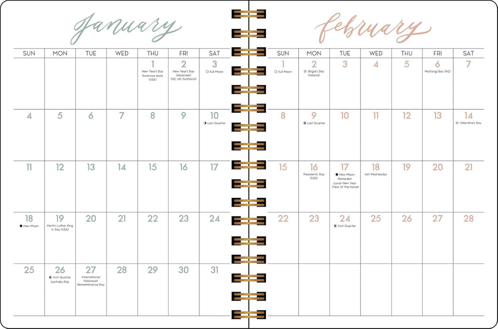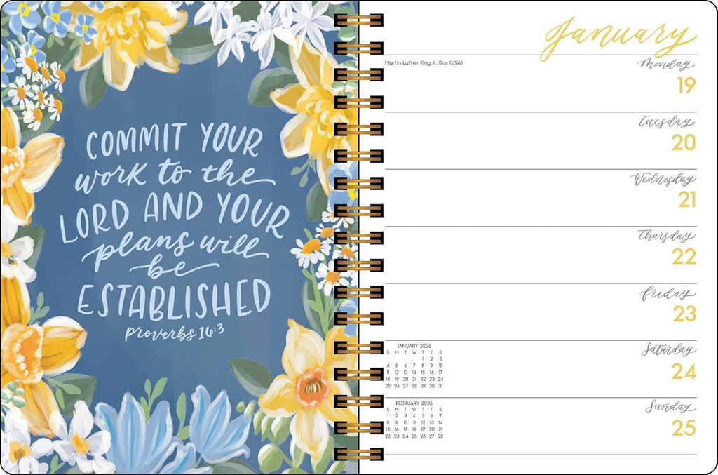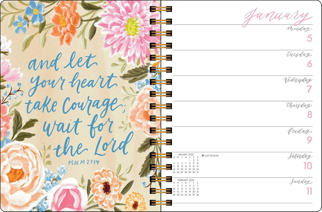 Estética y práctica, la Agenda Mensual/Semanal de 12 Meses de Escrituras y Flores 2026 de Tapa Dura te ayudará a organizar tu agenda y te inspirará serenidad y gracia. Cada página semanal presenta un versículo bíblico diferente, escrito a mano, acompañado de ilustraciones florales.