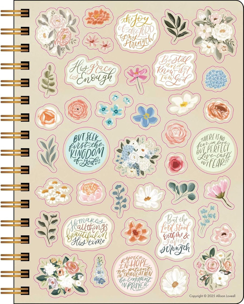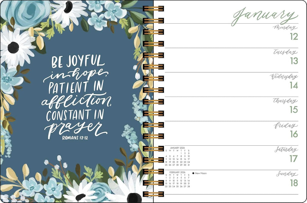Reflexiona sobre los versículos bíblicos mientras disfrutas de los hermosos diseños florales ilustrados de Allison Loveall con esta encantadora agenda.